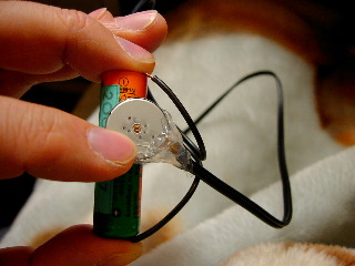 1.2Vのニッケル水素電池をつなぐと元気に動く。手を離すとそこら辺を飛び回るくらい。 |