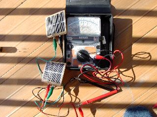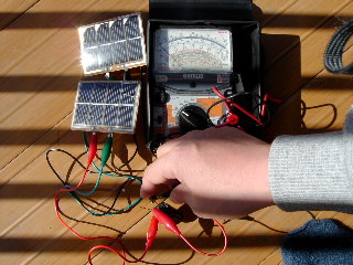 コンデンサにつなぐと一気に電圧が落ちた。さいしょはほとんどふれない状態。このコンデンサは「電気二重層コンデンサ」といわれる物、なんと10F。普通の電解コンデンサの1000倍以上の容量となっている。充放電回数も10万回以上、有機溶媒と活性炭を材料にしているので地球にも優しいが、絶対的な容量では二次電池には遠く及ばない。タイマーやプログラムのバックアップ電池や太陽電池時計などの蓄電源、電池交換時の補助電源に利用されているらしい。これ1個400円。