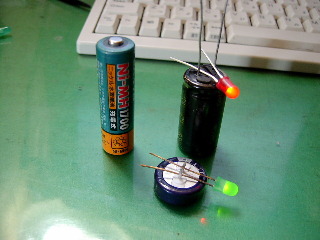 これで発光ダイオードにつなげば十分光ります。ここで使っているのはごく普通のLEDなので1.6V暗いあれば光るのだが、(それでも乾電池1個では光らない。)本当は超高輝度のLEDを光らせるつもり、こっちは2Vでも光らないので、今回の太陽電池では2つ直列で充電しないと電圧が足りなくなってくる。教材にするのにはコストがかかりすぎるかな。手前側の物も同じく電気二重層コンデンサ。こちらは1Fのもので200円だった。
