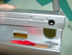 本体はUSBメモリとして動作するわけだが、MP3プレーヤーとして使うときにはバッテリーケースに接続することになる。 ヘッドホンをつなげるところはバッテリーケース側にこのような穴が空いているが、この設計では、抜き差しするたびにヘッドホンをはずさなければならない。何度も抜き差しするのはプラグやジャックにとっていいことだとは思えない。また、本体とのロックは、左側の写真の通り、メモリの真ん中に切った溝にノッチが引っかかることでなされるようになっていた。 |