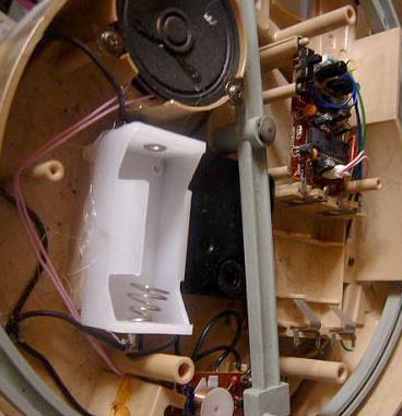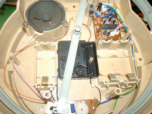 時計のモジュールはよくある安い物。以前技術の教材でつくった時計に使われていた物と同じだ。なんと単3電池の電池ボックス(右側の茶色のネジ台座が出ている部分)がそのままあるのに、そこの端子に左側の電池ボックスからのリード線を直接半田付けしてある。なんかほほえましいような作りだなあ。