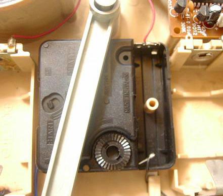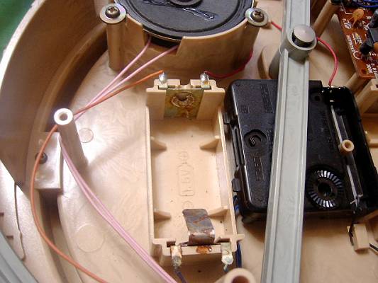 右側は無事だが、左側の電池ボックスが腐食している。それはさらにリード線までもダメにしていた。この時計は、左側の一つの電池で時計のモジュールと振り子もどきを駆動している。右側の2つの電池は、時報のメロディをならすための電源になっている。3つも使うのは効率が悪いような気がするが、メロディの回路はスピーカーを駆動するアンプも内蔵しているので、3Vが必要なのだろう。それに、それぞれの消費電力も違うから、交換時期はずれてくる。ということで、えらい目くじらを立てるほどの設計ではなかろう。しかし、時計が止まってしまっただけで、3本全部を取り替えてしまう人もいるだろうな。