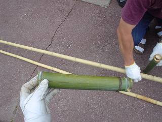 この後、久しぶりに竹馬に乗ってみたが、昔の感覚は忘れていずに難なく乗りこなすことができました。しかし、体重の増加はいかんともしがたく、とても片足だけでぴょんぴょんするようなことはできませんでした。今度はぜひ、足の位置が背丈くらいのものを作ってみたいな。