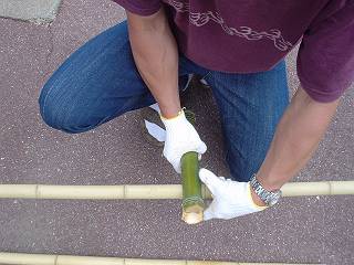 今回は、足を乗せる部分も竹で行くことになった。当初は木で作ることを計画していたのだが、竹をいただいた方のアドバイスによると、竹と木だと滑ってしまうので竹同士の方がよいとのこと。節を両側に残して一節分で切り落とし、片側を番線で締める。こちら側が足のかかと側となる。その後に、反対側からなたで2つに割を入れる。