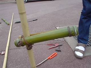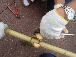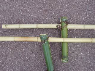 今回は1組分で左右作ったが、一つはこのように最初に竹を挟んだ口側を締めてから、斜めにかけてもう一度締めた。もう一つは、斜めに一つかけてしめただけのものにしてみた。