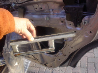 見ると,ガラスを押し上げるための支えがはずれてドアの下側に落ちて手いた。