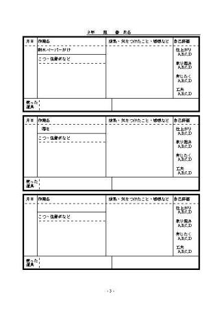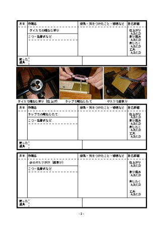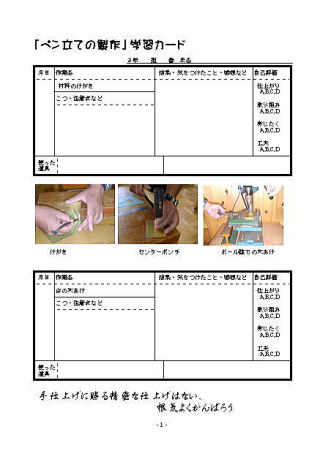 今回は『精密で美しい作品をつくろう』を目標に、各作業については、教師が一度師範を見せるだけで、細かい注意点などは作業の前にそれぞれが資料集や教科書で調べてから製作することとした。一つの作業にひとまとまりの記述形式として最初の時間に全員に配布してみた。