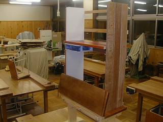 下の足は,2×4材。棚の板は以前のサファリ(車)で使っていたテーブル。横の板は前の先生がくれた床板(これで少し材料が片付いた)。