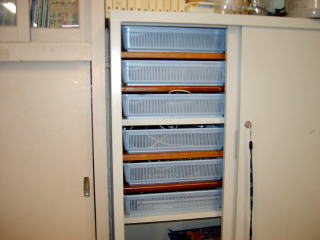 棚とトレイにはラベルを貼って,入れるところを決めて管理しやすくした。