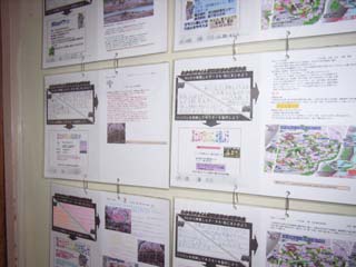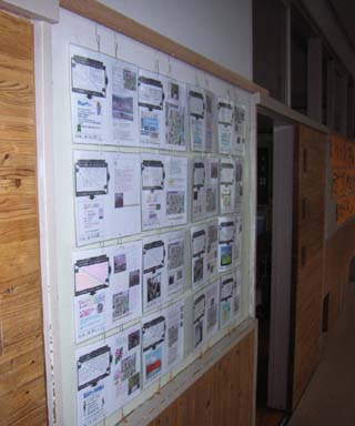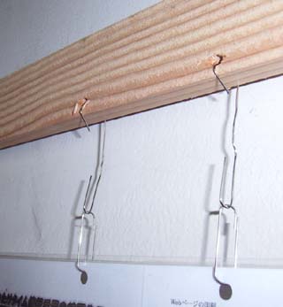 廊下には、帯のこで切断した古い柱を学級間の壁のところへ渡し、パンチの穴にあわせてゼムクリップを曲げて作ったフックにかけた。