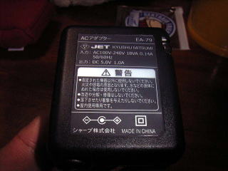 ○付属の充電器。5Vで1Aの出力。どんなものでも代用がききそうなので、適当なACアダプタを手に入れてコネクタだけあわせて、行く先々に置いておくのがよいだろうか。