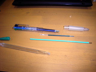 4色ボールペンを分解して、緑色のペンを抜き取った。(緑色はあまり使わなかったのに加えて、そこへ差し替える軸も緑色でちょうどよかった)