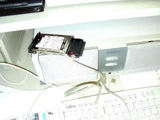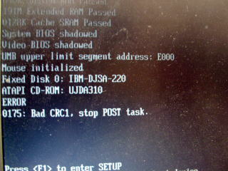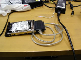 あきばおーからIDE to USB アダプタが届いたその日、知り合いの先生から電話があり、コンピュータが壊れて起動しなくなったとのこと。毎年この時期になると夏を何とか乗り切ったハードディスクがお亡くなりになることが多いので、おそらくそれだろうということで、テニス大会の後に、学校でデータ吸い出しを行うことにした。ノートパソコンをチェックしてみると、BIOSでセルフチェックをしている間にCRCエラーで止まってしまうので、HDDの障害ではなさそうだった(実際に、HDDを他のものに換えても同じエラーが出た)が、とりあえずデータは吸い出したいと言うことで、買ったばかりのアダプタを使ってみた。