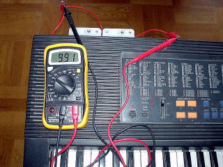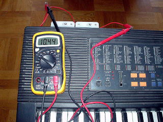 充電し終わった電池を入れると、10.44V。電源を入れて弾いている状態だと少し電圧が降下している。