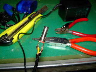 ACアダプタの方のコードを途中で切ってつなぎ直す。昔はこれをやるとよくカバーを間に入れ忘れたものだった。