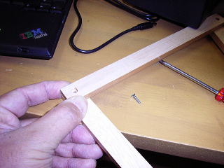 材料は2年前に使った1年生の木工でのあまり材(テーブルの天板を切った端材)。それを2組の2辺に切った。 表面は軽くベルトサンダーをかけて、片方に3mmのドリルで穴を開ける。 6mmのドリルで座ぐりをした後、もう一枚に木ねじで留める。