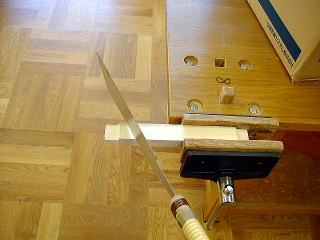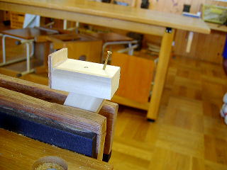 材料は前期の2年生が作った折りたたみ椅子の失敗したほぞ。目測で斜めにカット。