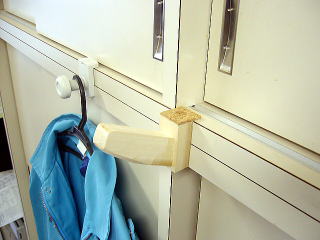 技術・家庭科の製作時には、生徒は運動着+手ぬぐい、自分はつなぎにぼうしという服装にしているのだけれど、帽子を掛けておくところにいつも困っていた。ハンガーを100円ショップで買ってきたハンガー掛けに掛けてその上に引っかけるようにしていたけれど、引っかかりが浅いので、ちょっとふれるとぼうしが落ちてきてしまってストレスがたまる。そこで、端材を使ってハンガー掛けを作ってみた。