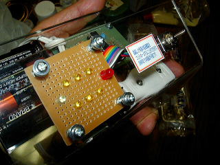 出口は普通のACコネクタ(120円)。左側はブレッドボードに挿したパネルLED。