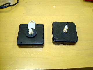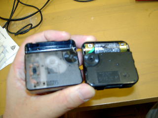 定番の教材用ムーブメント(教材どころか、市販品もみんなこれを使っている)なので、手持ちの「パソコンを使ってオリジナルウォッチ制作キット」に入っていたものを使おうとしたが、同じだと思っていたら少し違うものだった。電池の入っている方が本来使われていたもの。