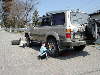 自分がナットの最初の緩めと最後の締め、ジャッキ操作とタイヤの換装を担当。