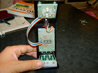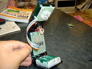 幅は単3電池3本用ボックスと基盤にあわせ、上にLED基盤を固定。首の部分にPICの基盤を固定した。
