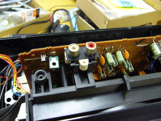 入力端子がなかったので、先日アンプにするための目的でオークションにて購入したものの、分解しただけになっていたラジカセの端子を利用することにした。(もっとも、テストにつかうだけで、このあとはちゃんと端子を買ってくる予定)