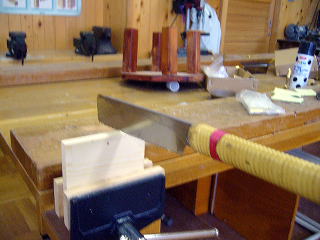底板の加工。首の部分の板がはまりこむようにのこぎりとのみで切り込みを作った。