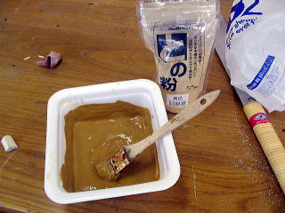 砥の粉を使うのも久しぶり、カップラーメンの容器で溶いてはけ塗りした。