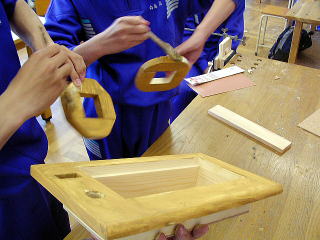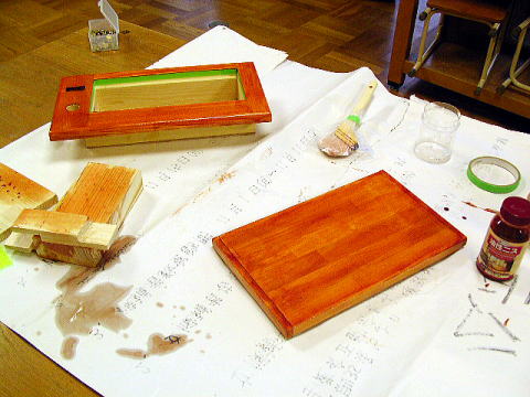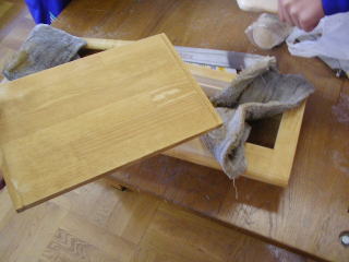 自分がやって見せた後、生徒達は自分の作った鍋敷きに塗った。生乾きの時に雑巾で拭く。