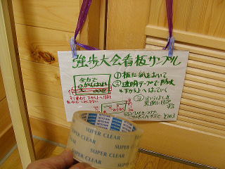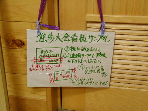 毎年恒例の経ヶ岳強歩大会。今年も地区生徒会担当なので、今度の日曜日は地区長達と山へ登って看板をかけてこなければならない。看板をつけてから約一週間ほど屋外に放置しなければならないが、それほど手間をかけるわけにもいかないので、昨年度から紙に書いて透明梱包テープで防水しながら固定することにした。