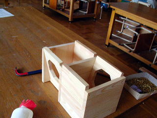 1年生のあまり材を利用し、スピーカの面は少し傾けて、飛び出た部分をのこぎり&かんなで仕上げて、後ろの板を付けた。