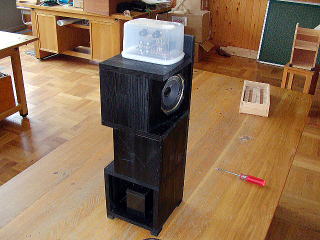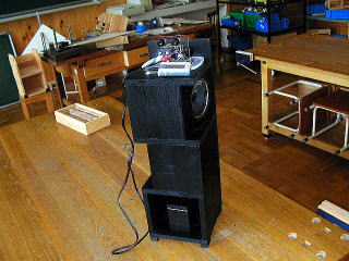 一番下にバッテリー、その上に2階建てでスピーカボックス。一番上にアンプを配置した。