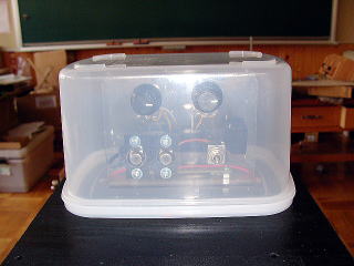 アンプの部分は、100円ショップで買った容器をひっくり返しにして取り付け、使わないときはカバーになるようにした。