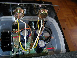 アンプは秋月電子のキットで1000円。スイッチやボリューム、入力端子はペット材に配置した。