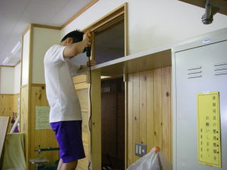 職員室を耐震工事のために一度取り壊したので、古い棚などから板をもらってきていた。