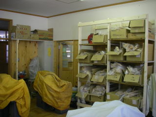 技術室の整理棚。職員室棚の引き戸を棚板にして、クラス数×2の大棚を作った。