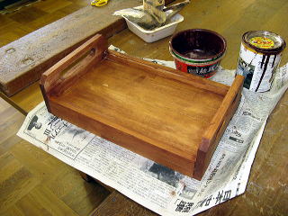 授業では使わなかったけれど、とのこを使ってみた。 とのこと今回のオスモワックスの相性はどうなのかな。 とのこが乾いたところで、塗装開始。マホガニーを選んだ。 塗装終了。授業でも実演してみたけれど、水道で水をかけてもしっかりはじくので、お盆としてもちゃんと使えると思う。 学校で自分用に使うことにした。