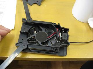 このクーラー、ノートパソコンの下部へ風を吹き入れるようにできているのに、ノートパソコンも内部のファンで下部へ空気を吹き出していると言うことで、空気の流れがぶつかってしまうとのこと。下部から吸い込むように改造したいとのこと。
