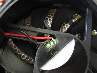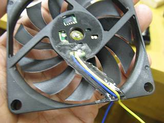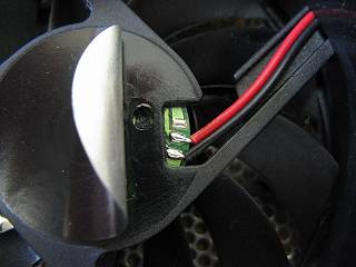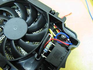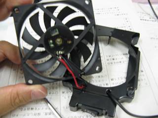 今度はいいかと思ったが、逆に付けることで、少しファンが下がってしまい、からからと接触するようになってしまった。そこで、ちょっとかっこわるいけれど、被覆コードでスペーサーを作ってファンを浮かせた。