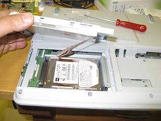 富士通biblo NB16。FDDドライブを2本のねじをゆるめて外すと下にHDDが控えている。