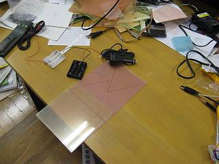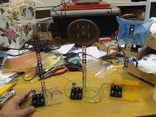 完成したところ。ごちゃごちゃした机でわかりづらいが、一番左は転倒スイッチ(左と真ん中の間に立てた板についている)により板が転ぶとランプがつくタイプにした。もう一つ、秋月の人体検知センサー(完成品850円)を使ったものも作ったが、どうやらセンサーが壊れているらしく動作しなかった。