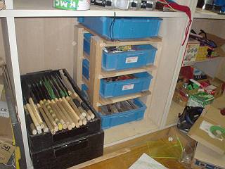 プラスチックのコンテナを重ねて置いているが、下に入れたものも取りやすいよう引き出し枠を作った。