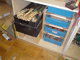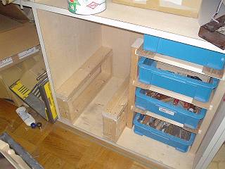 のこぎりの収納箱の上部があいていたので、下に足を作っておいてハタガネの収納スペースにした。