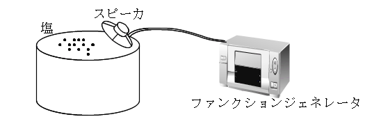 共振周波数の実験で、太鼓のような膜の上に塩粒を置いて共振したときにそれがはねるというのを観察するとのこと。