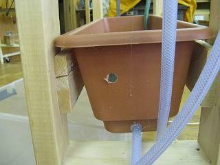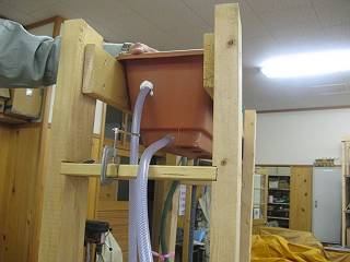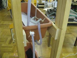 当然、オーバーフローだけではたまったままになってしまうので、下部からも細いビニールホースで抜いて時間差を作ることにする。
