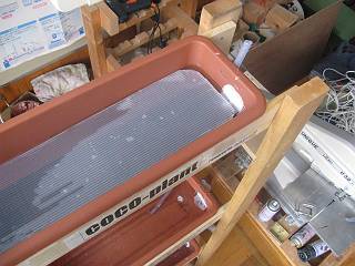 ポンプが稼働すると、そこそこの水量で供給を始める。プラスティック段ボールは針金をS字にしてつってある。