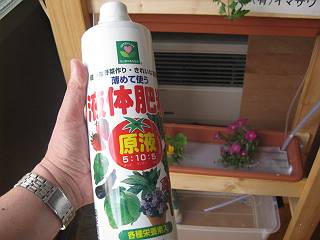真ん中の段はミニトマト。左右で種類の違うものにした。液肥は1000リットル用で498円。