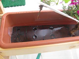水位の変化にあわせて、かなり支えのプラスティック段ボールが動いてしまうので、ペット材を曲げてホットボンドで止めてストッパーを作った。