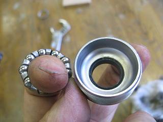 こちらも、ベアリングや「わん」に損傷は見られない。右側は新しいグリスを塗りつけたところ。